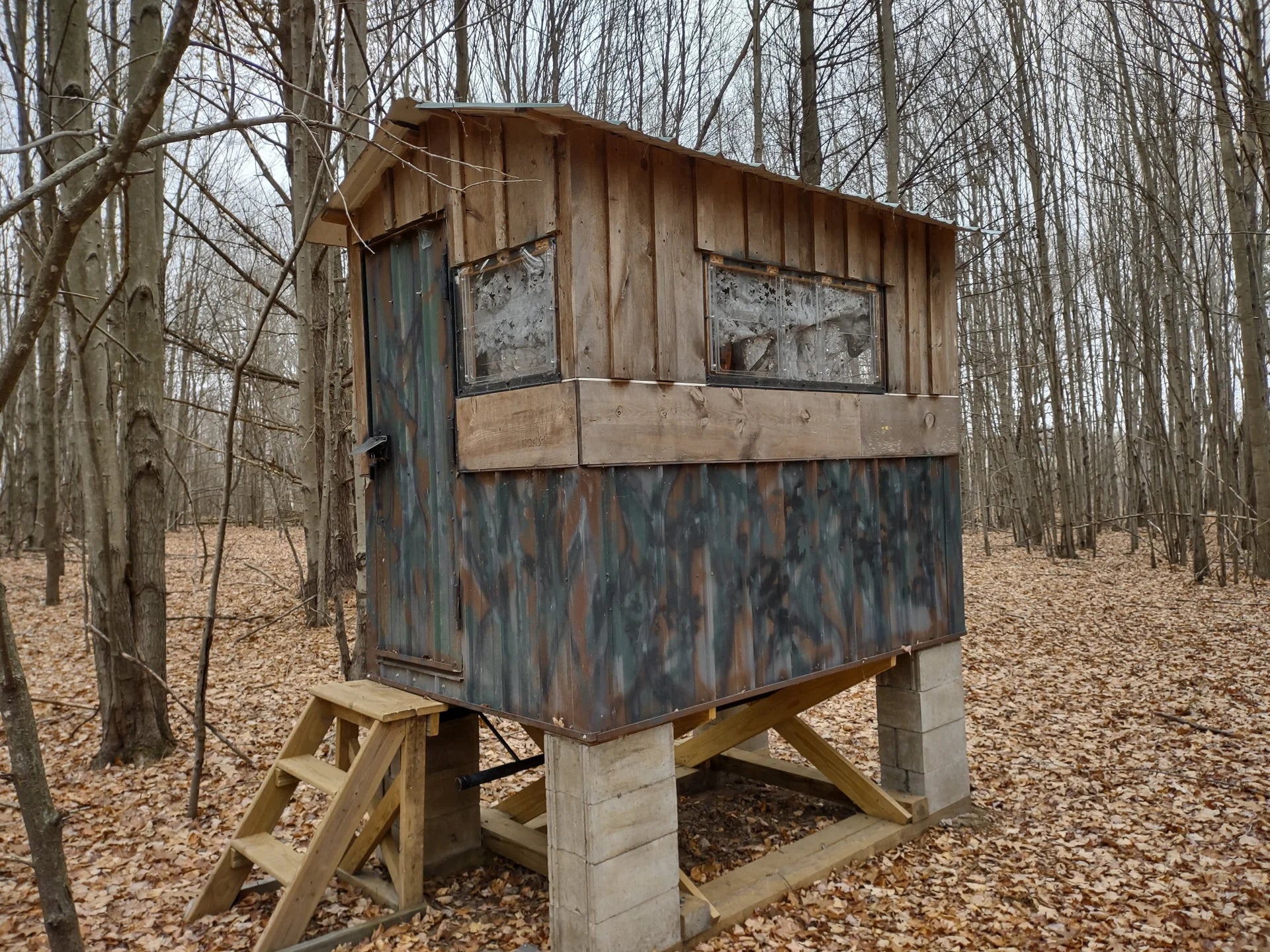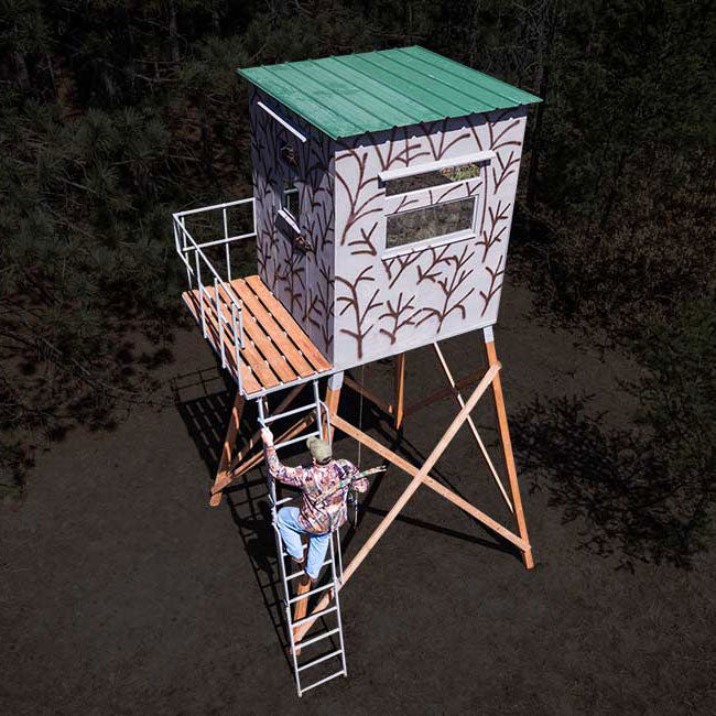 There are two types of hunting blind entries. A ladder that goes directly into the door and one that takes you to a deck where you enter your blind standing up.